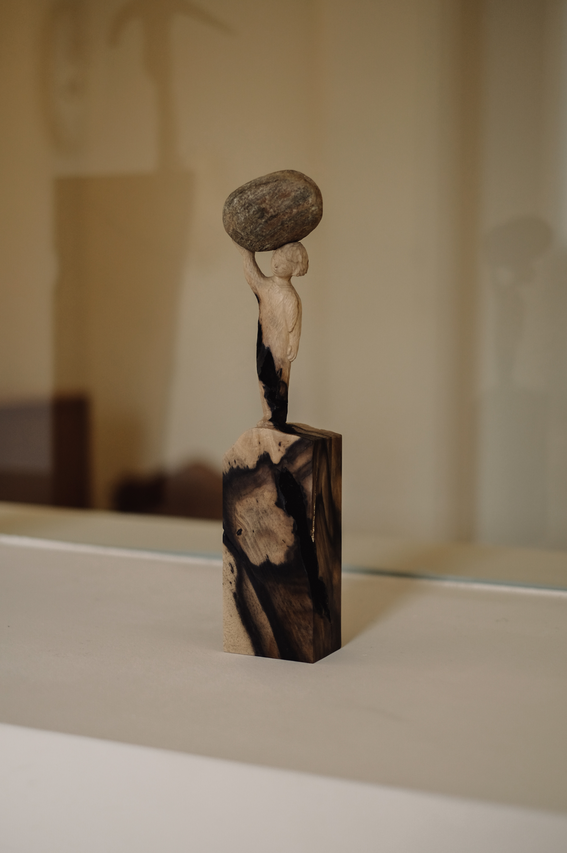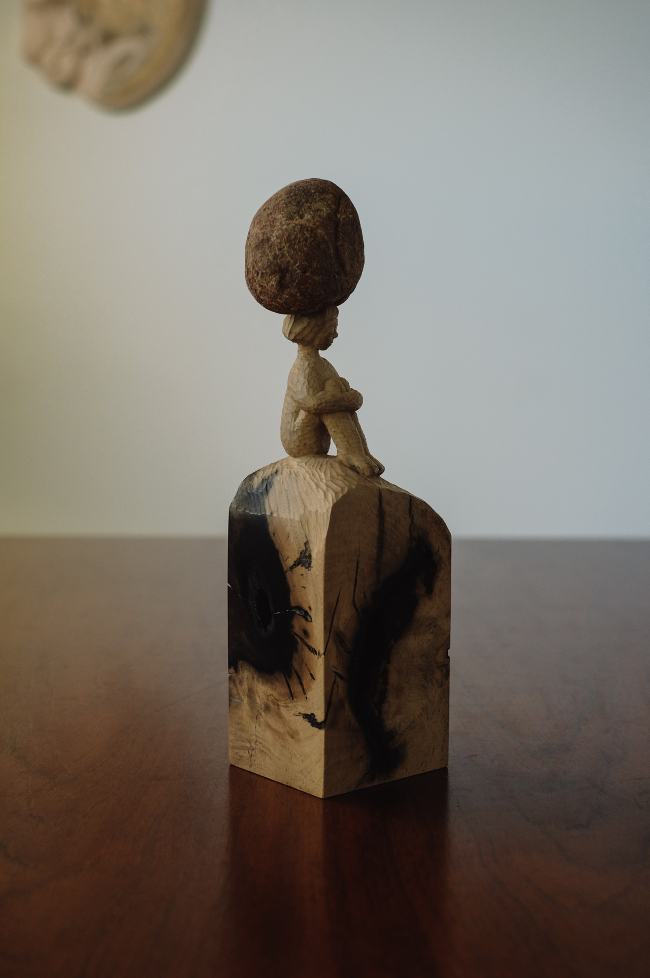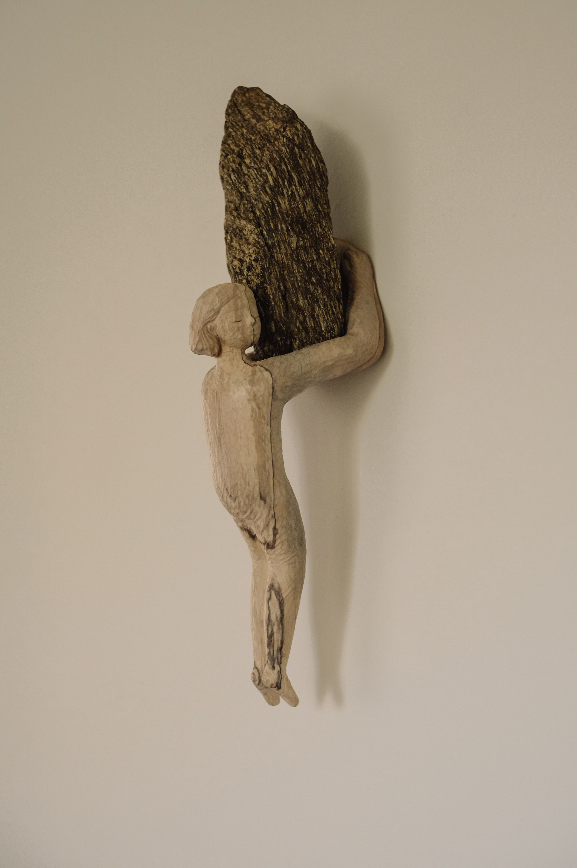 이번 전시에서 새롭게 선보이는 ‘돌을 이고 지는 형상들’은 작가의 사유가 깊어지는 지점을 보여준다. 돌을 든 조각들은 단순한 오브제가 아니라, 작가가 오래 사유해온 “삶의 고통을 들고 함께 걷는 방식”을 은유한다. 작가는 돌을 조각을 위한 받침이 아닌 하나의 주체적 재료로 사용하며, 강가와 바다에서 직접 주워온 돌의 자연적 결을 그대로 살려 조각과 결합시킨다. 이 형상들은 각자의 무게를 지닌 삶처럼 보이며, 그 무게는 결국 우리 모두가 짊어지고 있는 고통의 층위를 상징한다.